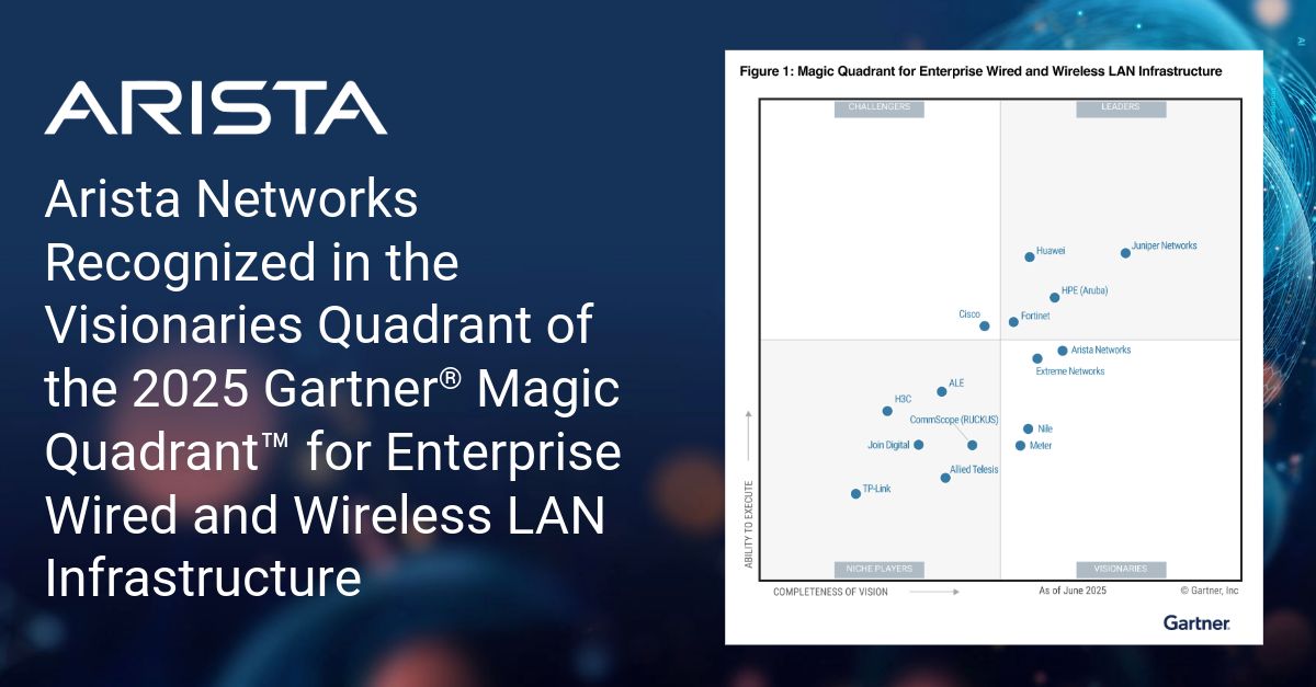 Visionaries Quadrant of the 2025 Gartner® Magic Quadrant™ for Enterprise Wired and Wireless LAN InfrastructureArista Networks Recognized in the Visionaries Quadrant of the 2025 Gartner® Magic Quadrant™ for Enterprise Wired and Wireless LAN Infrastructure